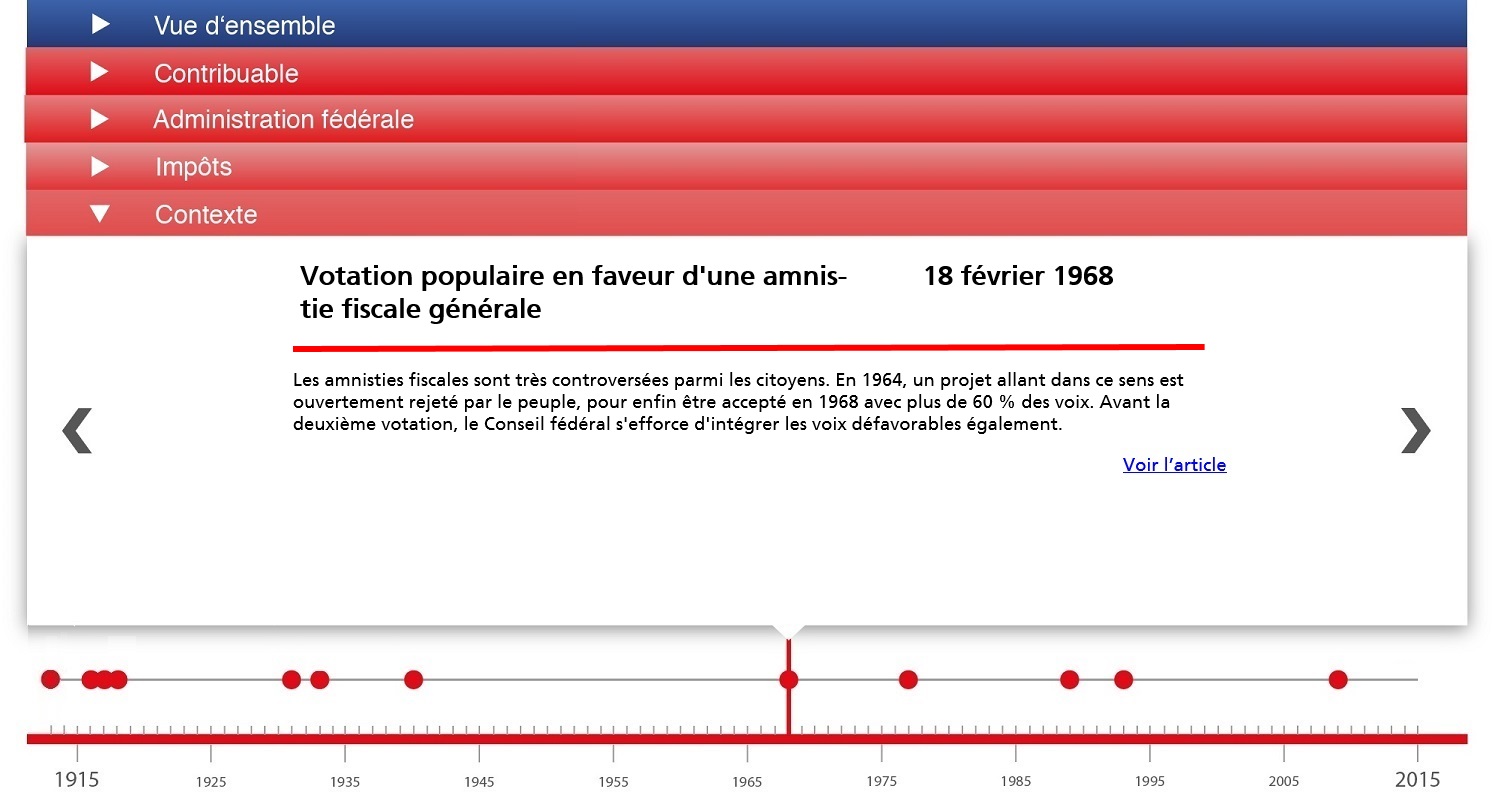 Retour Uebersicht 1er janvier 1913: Appel aux dons pour les avions militaires Du 10 au 14 octobre 1916: Réunion entre «hommes de confiance» en vue d'une réforme fiscale au niveau fédéral Du 23 au 24 avril 1917: Ascension de la place financière suisse Du 11 au 14 novembre 1918: Grève générale 15 juillet 1931:Signature du premier accord sur la double imposition avec l'Allemagne 13 octobre 1933: Adoption d'un programme de financement 30 avril 1940: Financement de la guerre et de la gestion des crises 18 février 1968: Votation populaire en faveur d'une amnistie fiscale générale 12 juin 1977: Votation populaire sur la réforme de l'impôt sur le chiffre d'affaires et l'impôt fédéral direct 7 mars 1989: Consultation concernant le nouveau régime financier 28 novembre 1993: Votation populaire pour une refondation du système financier et une réforme de l'impôt sur le chiffre d'affaires 13 mars 2009: Reprise des normes internationales relatives à l'assistance administrative   Link    Hintergrund