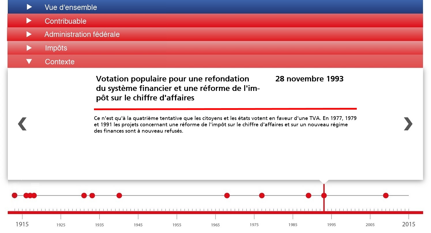 Retour Uebersicht 1er janvier 1913: Appel aux dons pour les avions militaires Du 10 au 14 octobre 1916: Réunion entre «hommes de confiance» en vue d'une réforme fiscale au niveau fédéral Du 23 au 24 avril 1917: Ascension de la place financière suisse Du 11 au 14 novembre 1918: Grève générale 15 juillet 1931:Signature du premier accord sur la double imposition avec l'Allemagne 13 octobre 1933: Adoption d'un programme de financement 30 avril 1940: Financement de la guerre et de la gestion des crises 18 février 1968: Votation populaire en faveur d'une amnistie fiscale générale 12 juin 1977: Votation populaire sur la réforme de l'impôt sur le chiffre d'affaires et l'impôt fédéral direct 7 mars 1989: Consultation concernant le nouveau régime financier 28 novembre 1993: Votation populaire pour une refondation du système financier et une réforme de l'impôt sur le chiffre d'affaires 13 mars 2009: Reprise des normes internationales relatives à l'assistance administrative      Hintergrund