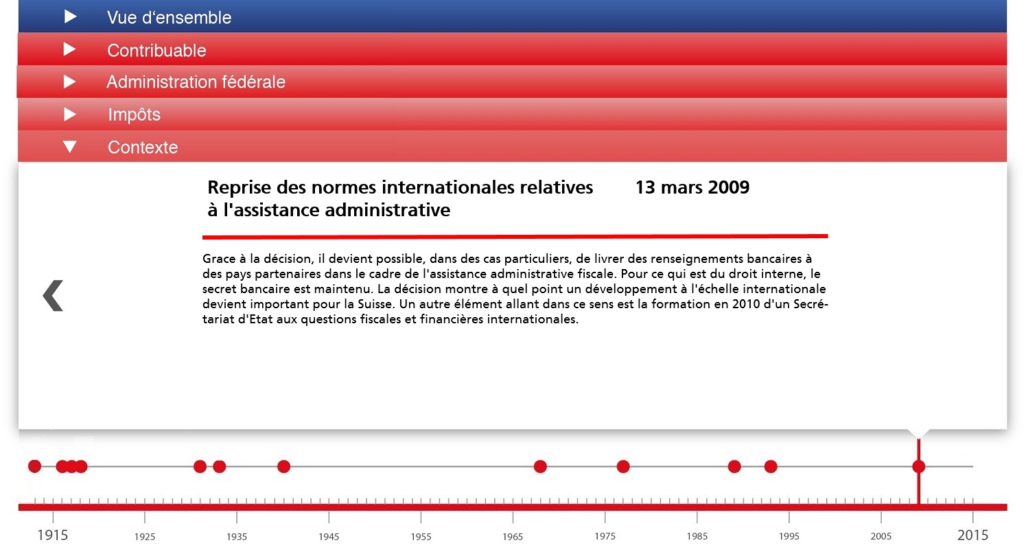 Retour Uebersicht 1er janvier 1913: Appel aux dons pour les avions militaires Du 10 au 14 octobre 1916: Réunion entre «hommes de confiance» en vue d'une réforme fiscale au niveau fédéral Du 23 au 24 avril 1917: Ascension de la place financière suisse Du 11 au 14 novembre 1918: Grève générale 15 juillet 1931:Signature du premier accord sur la double imposition avec l'Allemagne 13 octobre 1933: Adoption d'un programme de financement 30 avril 1940: Financement de la guerre et de la gestion des crises 18 février 1968: Votation populaire en faveur d'une amnistie fiscale générale 12 juin 1977: Votation populaire sur la réforme de l'impôt sur le chiffre d'affaires et l'impôt fédéral direct 7 mars 1989: Consultation concernant le nouveau régime financier 28 novembre 1993: Votation populaire pour une refondation du système financier et une réforme de l'impôt sur le chiffre d'affaires 13 mars 2009: Reprise des normes internationales relatives à l'assistance administrative     Hintergrund