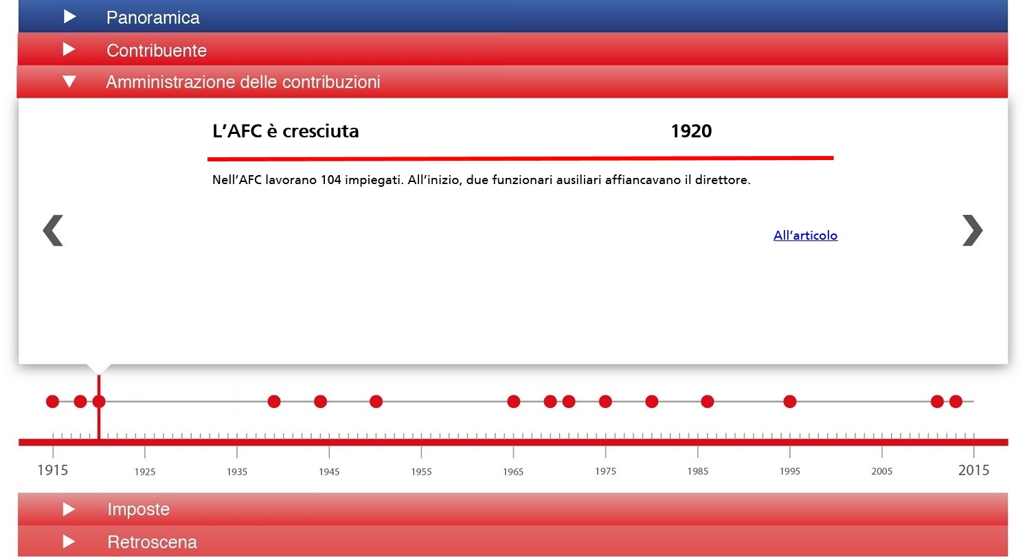 30 luglio 1915: Primo direttore Hans Blau 22 gennaio 1918: Ridenominazione in  «Amministrazione federale delle contribuzioni» 1920: L’AFC è cresciuta 1° settembre 1939: Paul Amstutz diventa direttore 1944: Programma di lavoro per l’ampliamento dell’AFC	1950: Creazione della sezione Affari internazionali 1965: Effettivi 1° maggio 1969: Entrata in servizio di Kurt Locherr 1971: Grande dispersione degli uffici 1975: Insediamento all’Eigerstrasse 61 1980: Insediamento all’Eigerstrasse 65 1° dicembre 1986: Entrata in servizio di Dieter Metzger 1° dicembre 1995: Insediamento alla Schwarztorstrasse 50 2011: Nuovi valori di riferimento dell’Ufficio 1° aprile 2013: Entrata in servizio di Adrian Hug